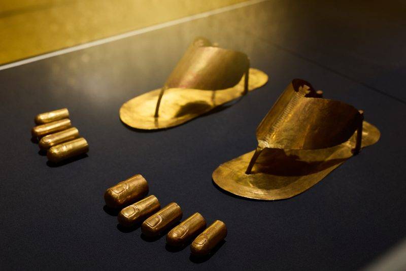 拖鞋及腳趾套 埃及,新王國時期,第18王朝,圖特摩斯三 世,約公元前1479–公元前1425年 金 出土自埃及,上埃及,底比斯,猴谷,D號谷, 圖特摩斯三世的三位外國王妃墓 Fletcher Fund,1921至1922年 紐約大都會藝術博物館 26.8.146a, b; 26.8.185, 26.8.186, 26.8.187, 26.8.188, 26.8.189, 26.8.193, 26.8.194, 26.8.198, 26.8.199(圖片來源:香港故宮文化博物館)