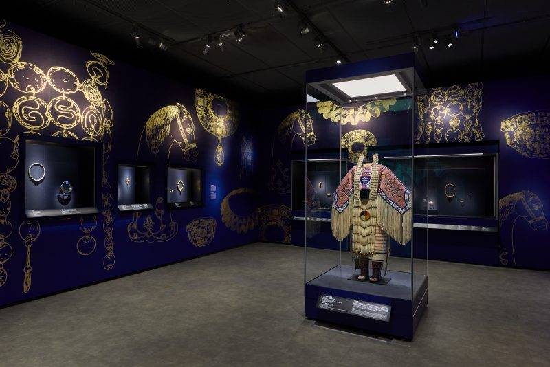 黃金自古以來就是珠寶首飾不可或缺的材料,更是古人眼中連接神靈的神聖媒介。展覽第一單元「金飾——聖人之軀」中,香港故宮文化博物館夢蝶軒收藏的動物紋冠與來自南美洲哥倫比亞的古老頭飾並列展出。