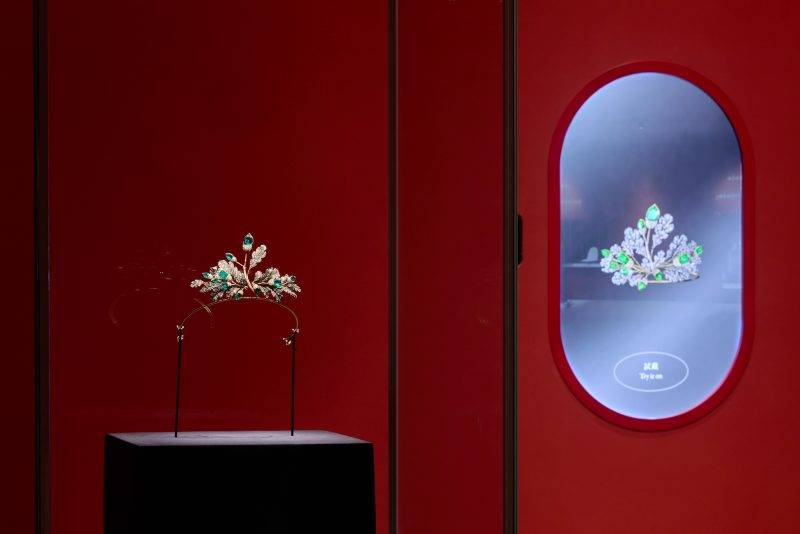 展覽設有互動式多媒體裝置,邀請觀眾 虛擬佩戴三件精選珠寶,沉浸式感受珠 寶賦予身體的蛻變力量。(圖片來源:香港故宮文化博物館)