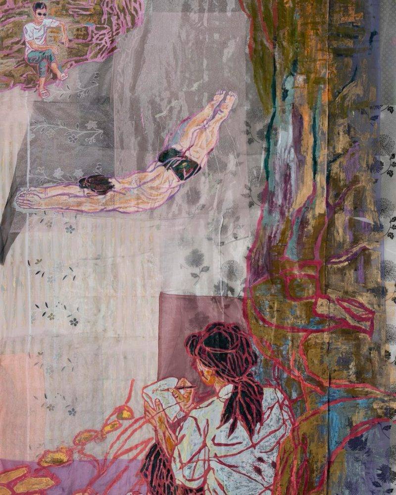 韓國藝術Jeong‑A Bang 帶來兩幅於半透明布料上創作的壓克力畫。《Oliver Stone’s Swimming》(2024)靈感來自紀錄片《Nuclear Now》(2022)中的一幕,探討科技進步背後的道德和環保考量。《The Space Between Us》(2025-26)則呈現了兩個濟洲柑橘,引領觀眾思考時間流動和人際關係的微妙連結。
