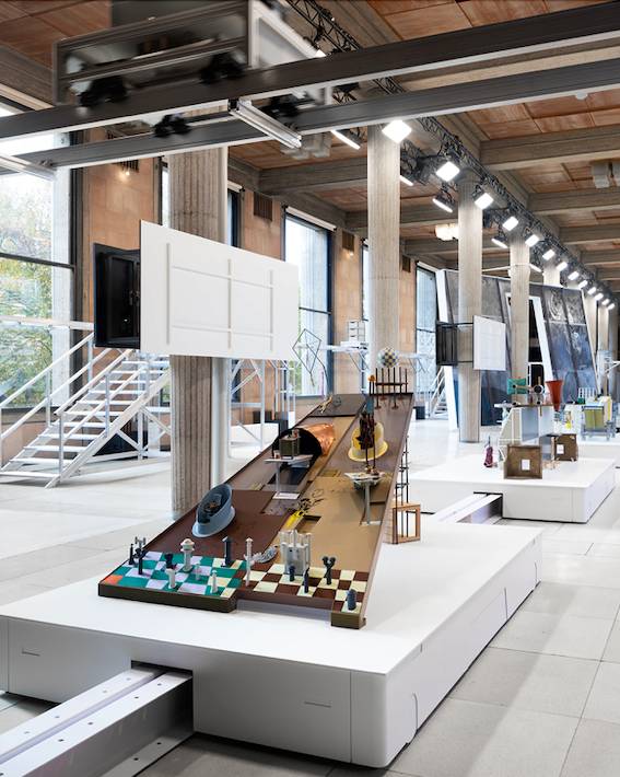 工業化運輸軌道貫穿整個空間,緩慢運行,載有箱子、書籍、音響、服飾及廣告物品,象徵持續網絡化經濟,但在上午12點與下午6點暫停,呼應人類意圖。