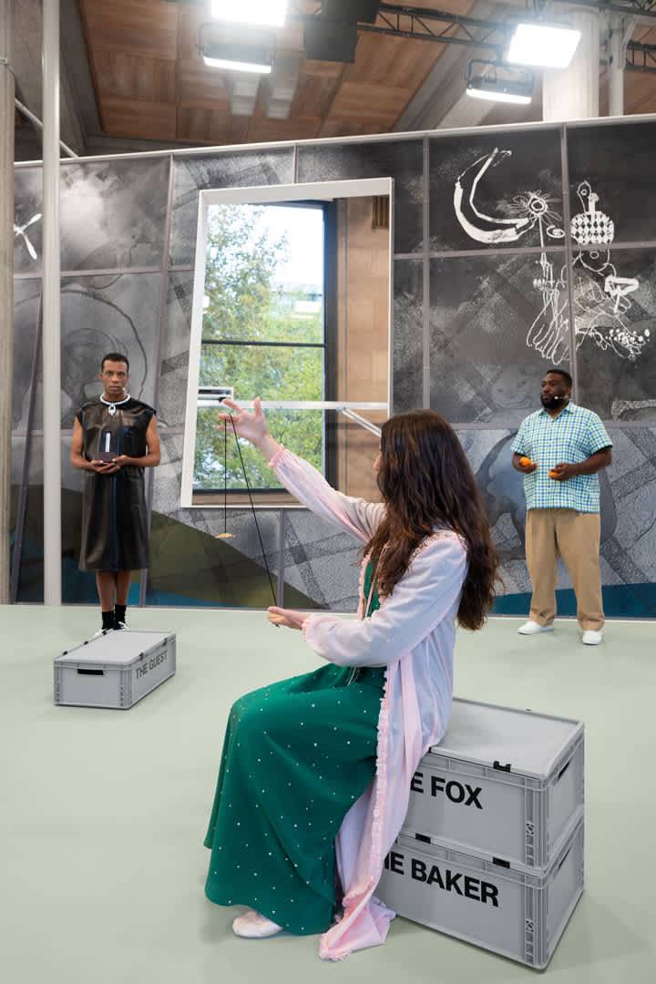 Fabio Cherstich:首先,故事線非常重要,它幫助觀眾理解發生了什麼以及誰在表達。其次,場景之間有對位和橋接,節奏變化豐富。例如,有無伴奏的a cappella片段,接着是音樂介入的編舞動作,再到視頻展示,給觀眾休息的空間。 故事是通過不同媒介展開的—視頻、表演、空間、裝置、聲音——但所有元素都服從同一條故事線。我們跟隨一天的時間軸,從夜晚開始,結束於夜晚,形成一個圓環式結構。故事講述的是村莊中一天的生活,可以發生奇妙甚至不現實的事件,讓觀眾感受到自由和烏托邦般的體驗。