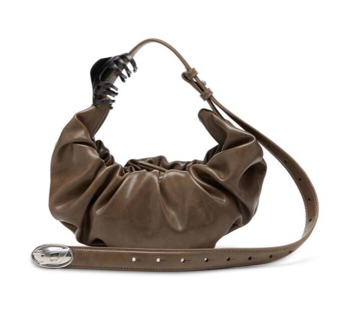DIESEL秋冬時裝騷推出的Grab-D採用慵懶的流浪包輪廓,拉鍊處飾以褶皺,營造出蓬鬆感。包身採用創新材料製成,觸感柔軟閃亮,肩帶設計有如腰帶,可以調節成手提或肩背長度,加上髮夾點綴,設計簡約型格。