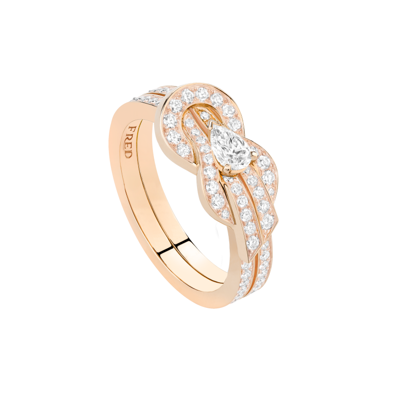 FRED Chance Infinite的標誌性設計元素為橫向的「8」字,體現幸運符號的守護精神,把這系列的首飾送給摯愛就最適合不過。這款玫瑰金鑽石戒指以一顆梨形美鑽為主石,周圍的蝴蝶結設計線條柔和,散發圓渾美感,單獨配戴已經很好看。
