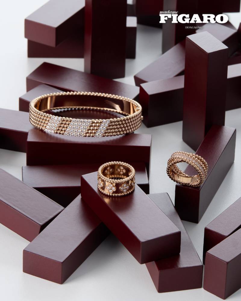 Perlée diamonds bracelet, 5 rows, medium model in 18k rose gold, diamond. Perlée clovers ring, medium model in 18k rose gold, diamond. Perlée diamonds duo ring in 18k rose gold, diamond. VAN CLEEF & ARPELS (圖片來源:MF編輯部)