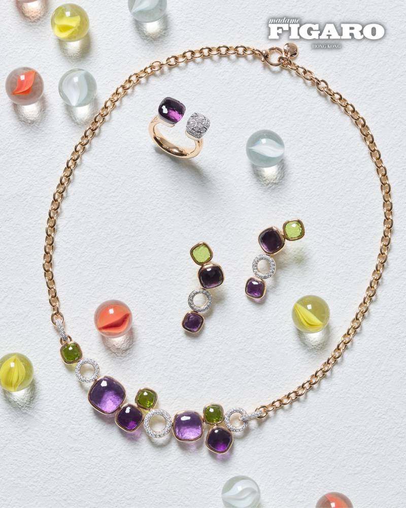Nudo Collection ring in 18k rose & white gold with 1 amethyst (≈7cts) and 39 white diamonds (≈0.8ct) on 18K rhodium-plated white gold. Nudo Collection earrings in 18k white & rose gold with 4 amethysts (≈12.3cts), 2 peridots (≈6.4cts) & 72 white diamonds (≈0.3cts) on 18k rhodium-plated white gold. Nudo Collection necklace in 18k rose & white gold with 4 amethysts (≈34.5cts), 3 peridots (≈9.6cts), 110 white diamonds (≈0.6cts) on 18k rhodium-plated white gold & 32 white diamonds(≈0.1cts) on 18k rhodium-plated rose gold. POMELLATO (圖片來源:MF編輯部)