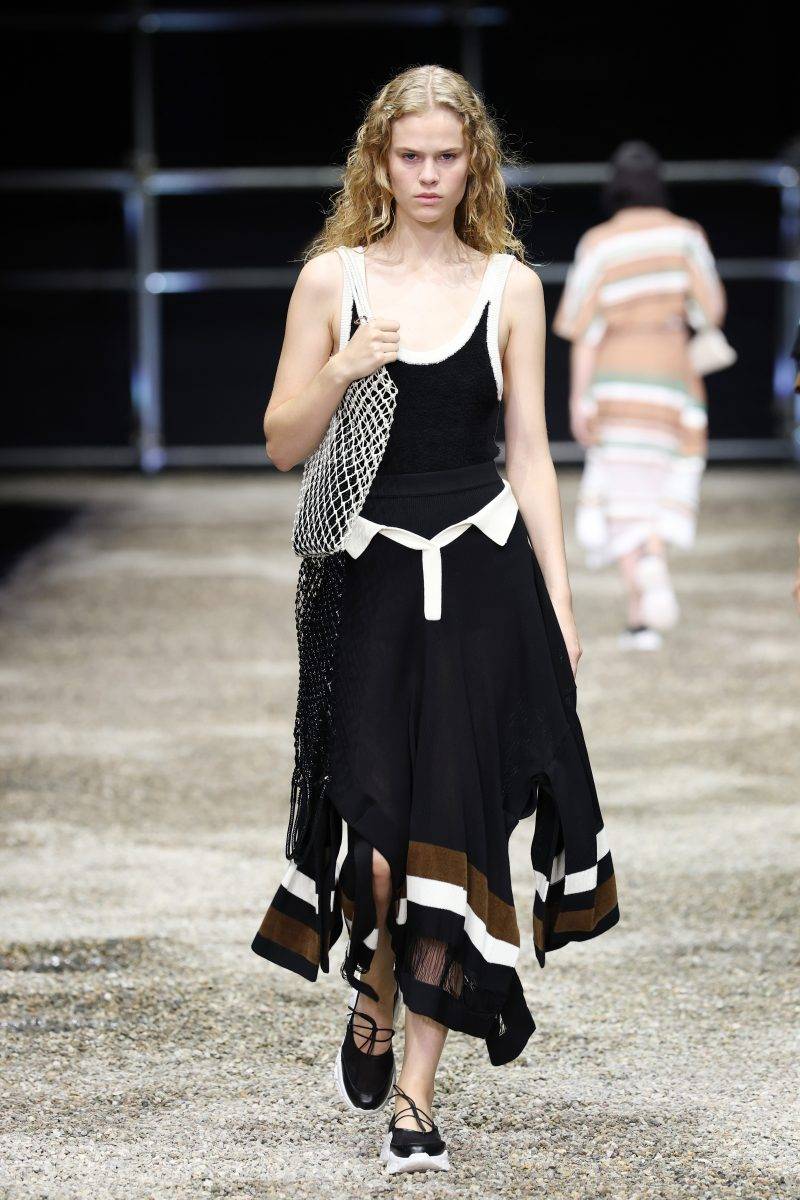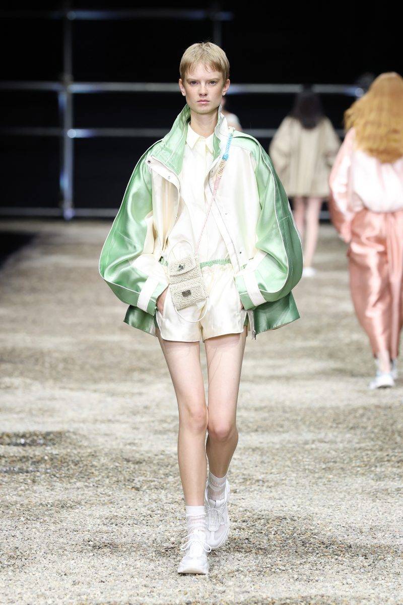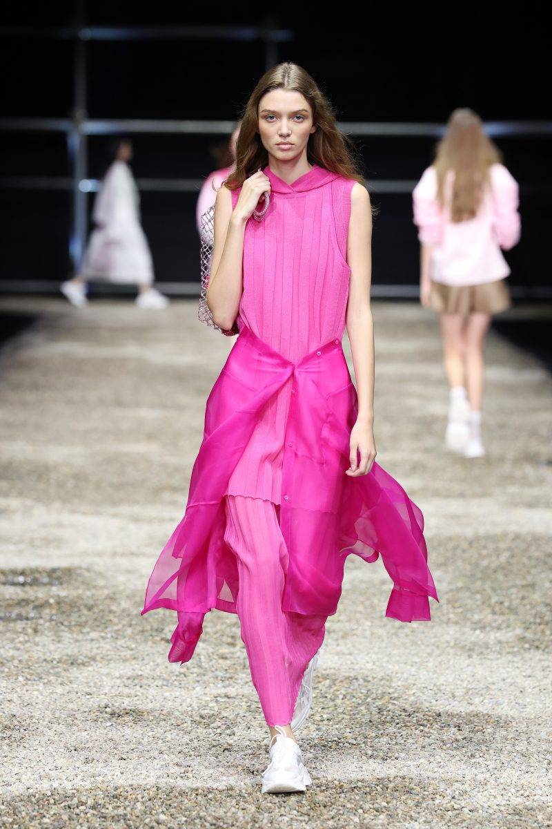 是誰規定了恤衫只能當上衣?受岩崎「倒置城市」與懸浮結構的啟發,ANTEPRIMA將服裝打破常規外套可轉化為裙裝,POLO衫幻化成飄逸長裙;繭形褲帶來雕塑般的獨特輪廓。而品牌標誌性的透明針織與印花薄紗疊層,輕盈如霧,與短版風衣、俐落工業感網布形成鮮明對比,在柔美與剛毅間遊走。加上,系列運用藍、綠、紅、黃等鮮艷色調,與象牙白、蜜桃粉、天藍、薄荷綠等柔和粉彩互為對照,既代表生命力的張揚,也喚醒細膩的女性能量。