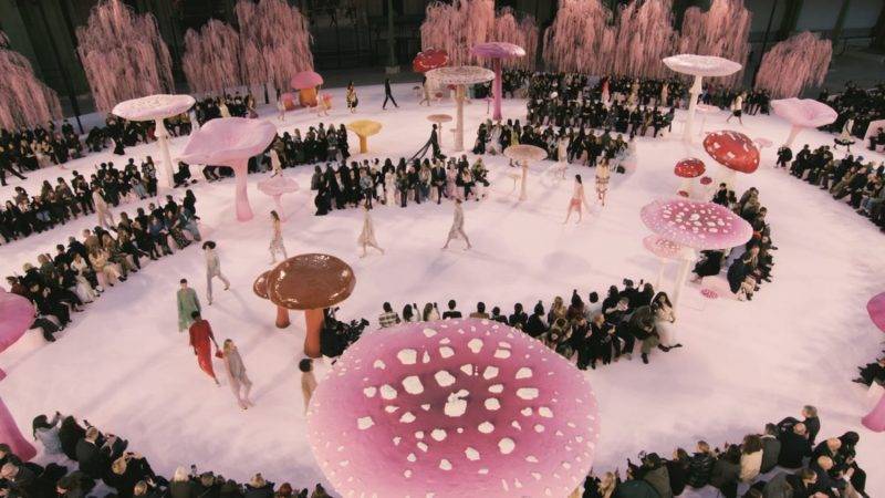 昨晚,巴黎大皇宮被改造成一片粉色秘境,柔霧繚繞的樹林中,巨型蘑菇拔地而起,彷彿走進一幅奇幻插畫之中。Blazy在此築起他的第二個CHANEL世界,不同於過往的宇宙意象,這一次更像一場被放大的童畫夢境。正如為時裝騷開場的那俳句:「飛鳥棲蕈頂,拈來美景入畫卷,轉瞬逝無蹤。」那道轉瞬即逝美麗的風景,將捕捉於巴黎大皇宮之中。
