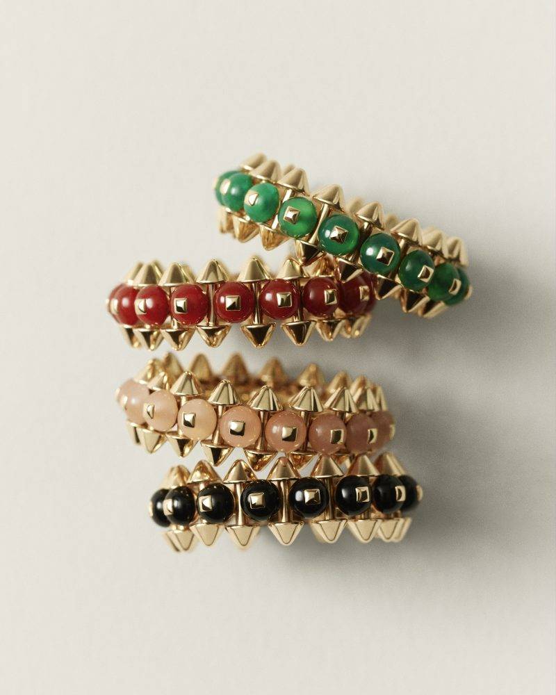 除了金屬工藝的突破,色彩的加入則為Clash de Cartier注入了感性靈魂。全新作品大膽運用染紅色、染綠色瑪瑙、粉紅色玉髓與縞瑪瑙,與玫瑰金飾釘交錯排列,營造出和諧而深邃的視覺層次。每一顆圓珠均經過嚴格挑選,尺寸與色調的精準匹配僅在毫釐之間。