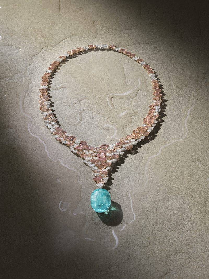 系列分為3大主題篇章,首先是「碧海之光」,頌揚地中海沿岸的旖旎風光。Marea Rosa項鏈恍若海浪輕拂岸邊,以一顆逾46克拉的珍罕莫桑比克帕拉伊巴碧璽為主石,藍綠色調映照撒丁島的清澈海水,交織白金與玫瑰金,鑲嵌粉紅摩根石與鑽石,猶如沙灘的溫暖與波光的粼粼,喚起海洋的活潑色彩與優雅風情。