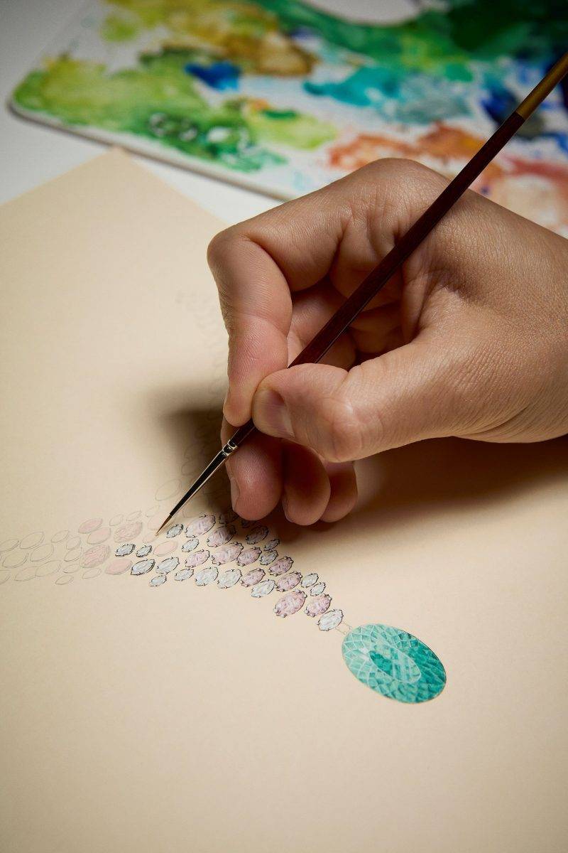接着是「心靈風景」,向內陸的壯麗自然致敬。Dolce Stil Novo項鏈如珠寶詩篇,勾勒托斯卡納起伏的山脈、蜿蜒山徑旁邊的柏樹和野花盛放的草地。以31.46克拉哥倫比亞“Muzo”鮮綠色調祖母綠為亮點,融合黃金、玫瑰金與黃鑽、啡鑽,靈活設計可分拆成短項鏈與手鐲,捕捉山巒青翠、白雪潔白與湖水深藍的真實色譜,譜寫純粹的自然史詩。