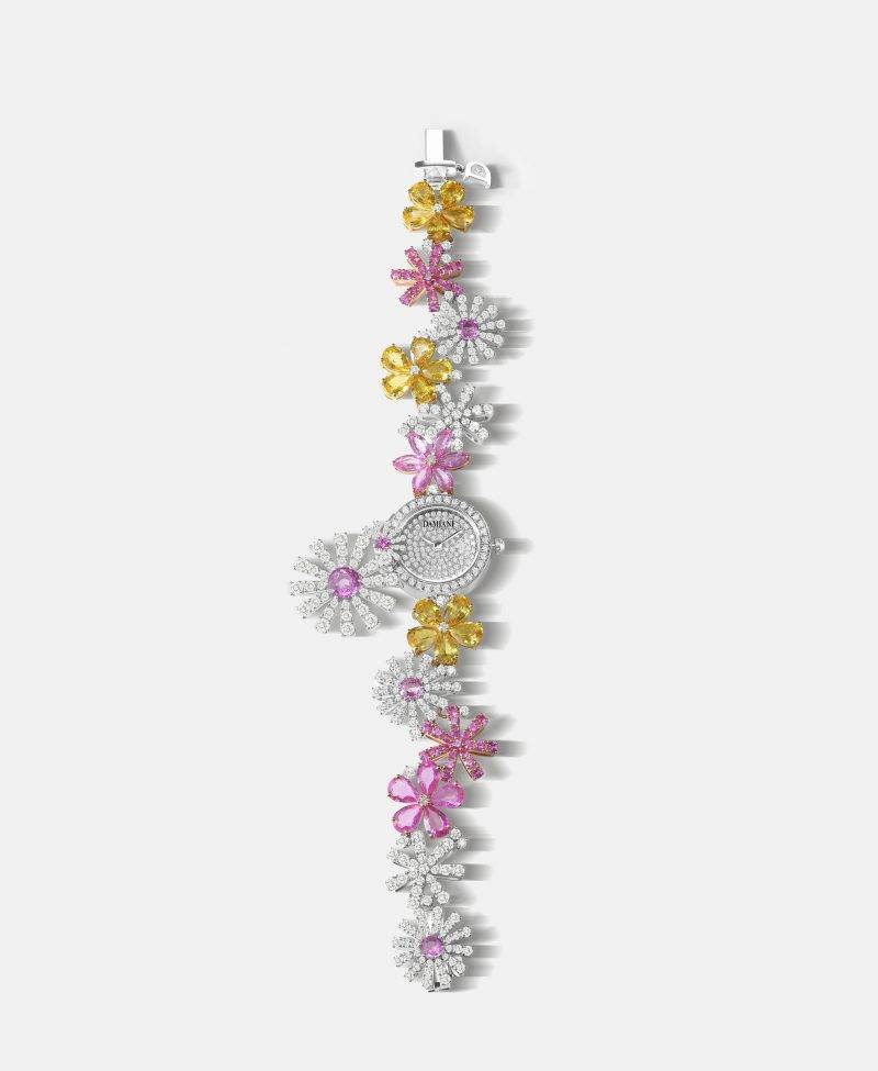Colline In Fiore in white and pink gold watch set with 49 brilliant-cut pink sapphires of 5.06 carats, 6 marquise-cut pink sapphires of 2.48 carats, 20 pear-cut pink and yellow sapphires of 16.28 carats, 376 brilliant cut diamonds of 6.81 carats.(圖片來源:Damaini)