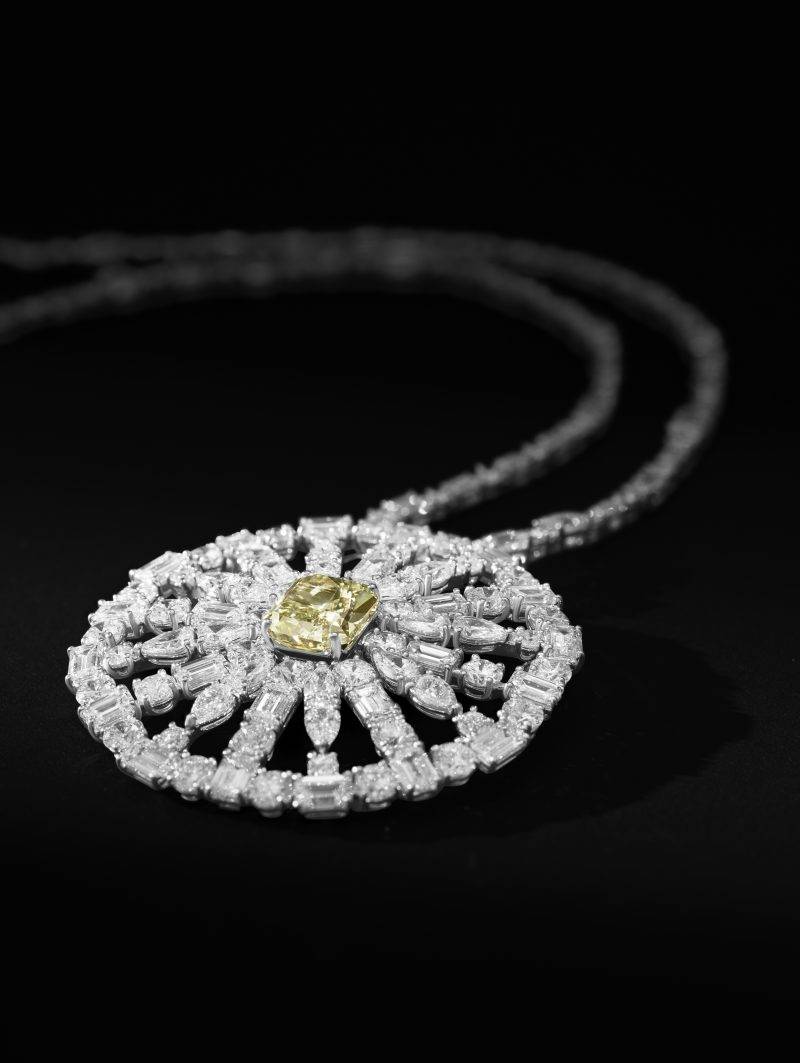 Aethernitas necklace in white gold, set with 1 cut-cornered rectangular fancy yellow-green diamond of 5.01 carats and diamonds.(圖片來源:Damiani)