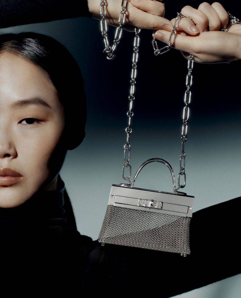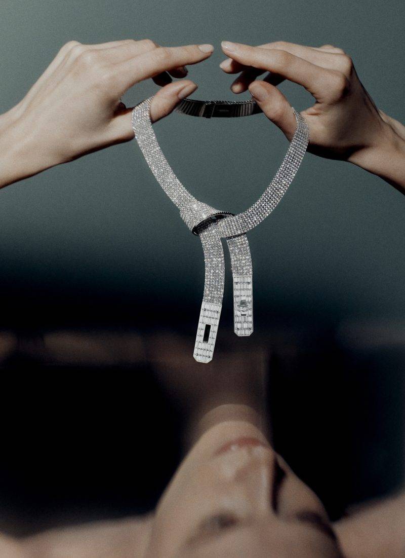 Kellymorphose系列涵蓋多個項目,其中Kelly Gavroche項鏈尤為矚目。其設計仿如絲巾輕繞頸項,白金鏈帶上鑲嵌1,771顆美鑽,總重達74.32克拉,流暢的線條與光影交錯之間,展現出品牌對動態美感的極致追求。Kelly Gavroche雙圈戒指以不對稱造型打破傳統,玫瑰金與258顆鑽石交織出流動的節奏,無論是單戴或疊搭,都能為指尖增添一抹靈動的時尚趣味。還有非常可愛的Sac Bijou Kelly手袋,是一個以純銀打造的微縮版Kelly bag,將珠寶與手袋的界線徹底模糊。