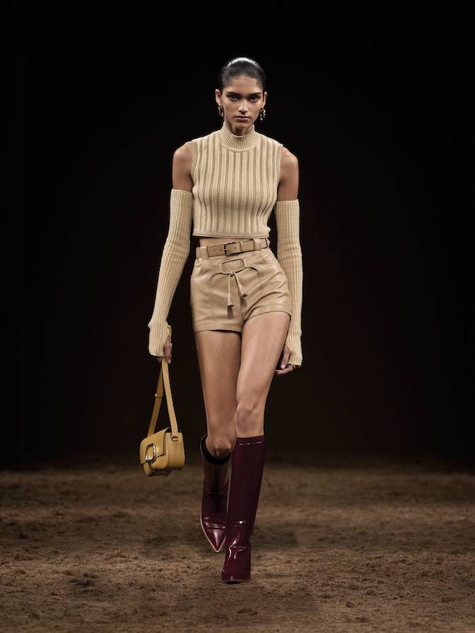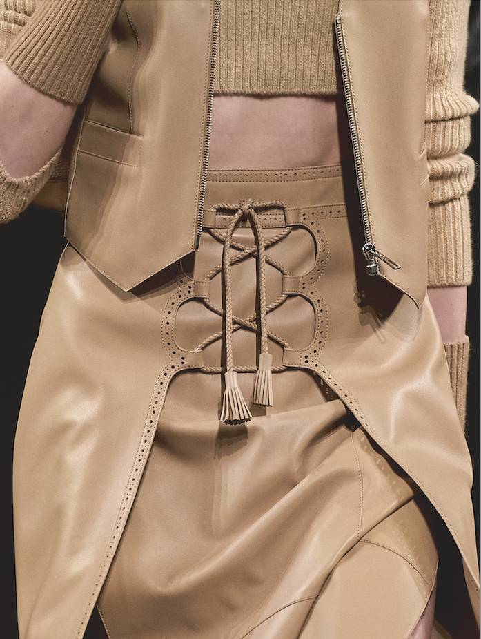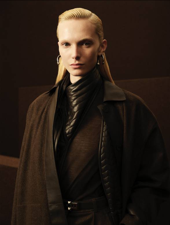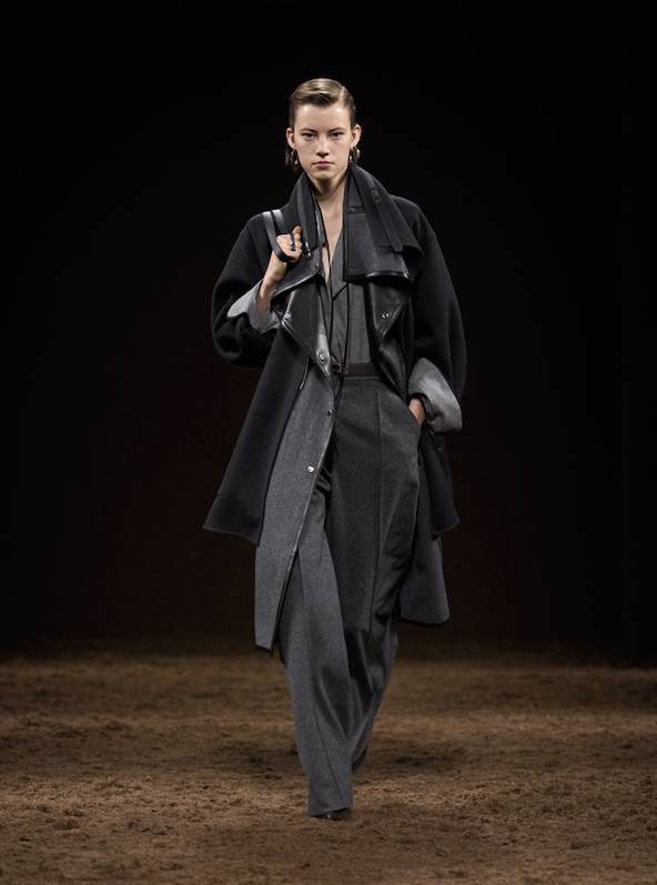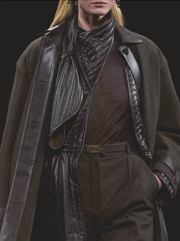 本季的服裝色調是對大自然沉靜力量的歌頌。整個系列 開首以沉穩的黑色揭開序幕,隨後過渡到豐富的大地色系:米色、棕色與灰色,令人聯想起大理石、板岩和木炭的自然紋理。這些色彩為毛氈和皮革提供了最佳的 舞台,突顯了面料的深度與層次。此外,系列中巧妙地鋪展開不同層次的明亮色彩,猶如鬱鬱森林中的驚鴻一 瞥。明亮的綠色調和漿果般的酒紅色作為點綴色出現,打破了秋冬的沉悶,帶來一抹高雅而深邃的活力。這種色彩的運用極為克制與精準,傳達了真正的奢華是關於優雅的質感與「深思熟慮」的層次,而非喧囂的色彩。