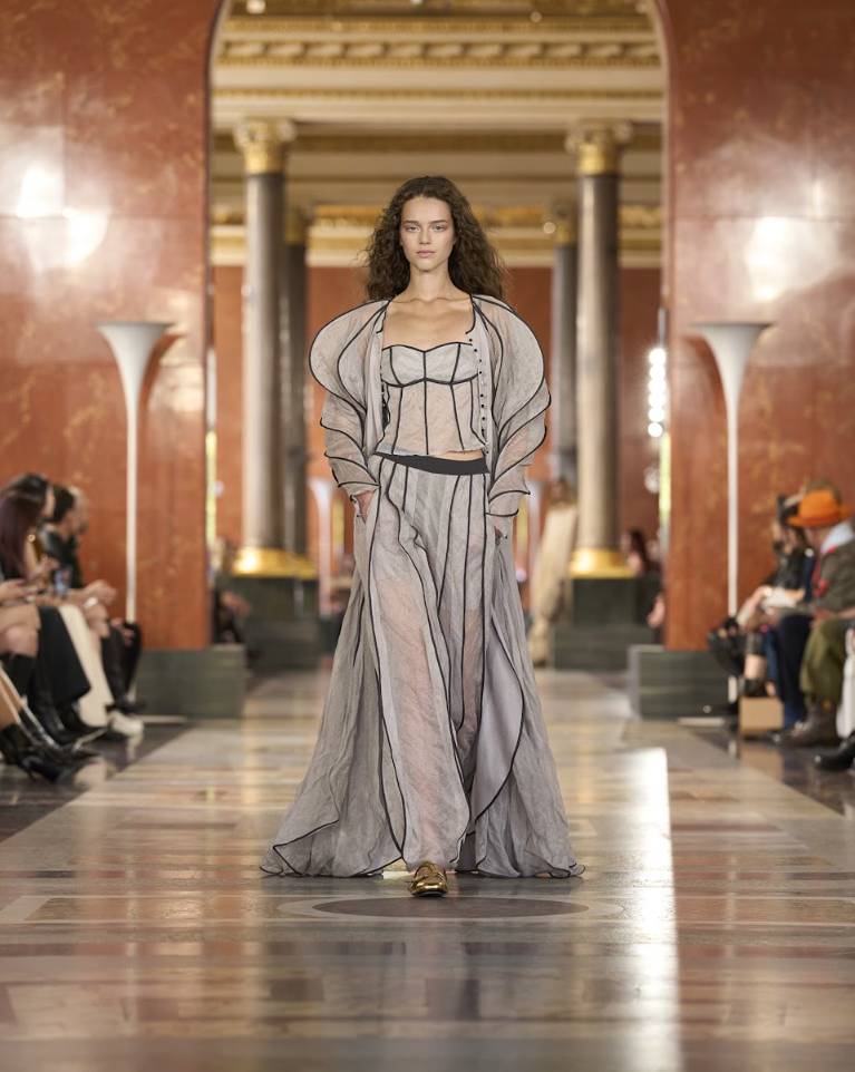本季造型自最柔美的居家廓形開始,飄逸的剪裁配合極輕盈的布料,縱是輕盈,卻巧妙的利用了剪裁,在細節與線條上依然保有Nicolas擅長的建築感輪廓,為柔美的造型豎起輪廓。立體廓型的塑造在今季亦再次被強調,把材質的運用發揮得淋漓盡致,先是利用了柔軟布料製作出輪廓硬朗而分明的上衣,再配搭透薄而垂墜感十足的褲裝,帶來了鮮明的對比。柔與剛、飄逸與結構並存,讓「室內穿着」變得毫不隨便,在自己的空間裏,也值得最講究的美。