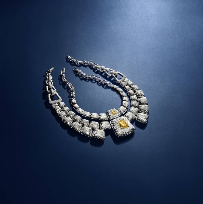 系列中的代表作如Kalahara項鏈,以接近35克拉的黃鑽為主石,結合4種佩戴方式,展現珠寶的靈活與多變;Mirage項鏈則以沙丘的流動為靈感,在砂金與密鑲鑽石中捕捉海市蜃樓的瞬間; Fauve項鏈以獅爪的刻痕詮釋一份野性,力量在光影中悄然綻放;而Zebra Mnyama項鏈則以斑馬條紋為設計語言,由縵瑪瑙與長梯形切割鑽石展現建築般的幾何美感。這系列植根當代高級珠寶創作理念,施展出包鑲、雪花鑲嵌、環鑲等多元鑲嵌工藝搭配枕形、長梯形、心形等切工,彰顯家族傳承。