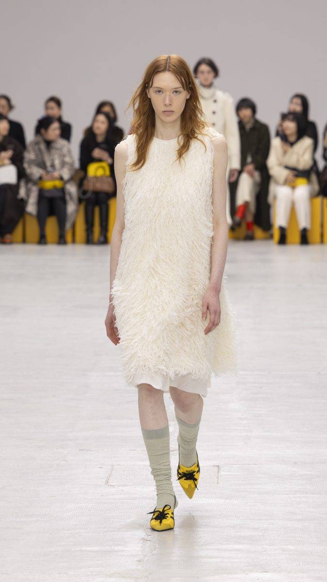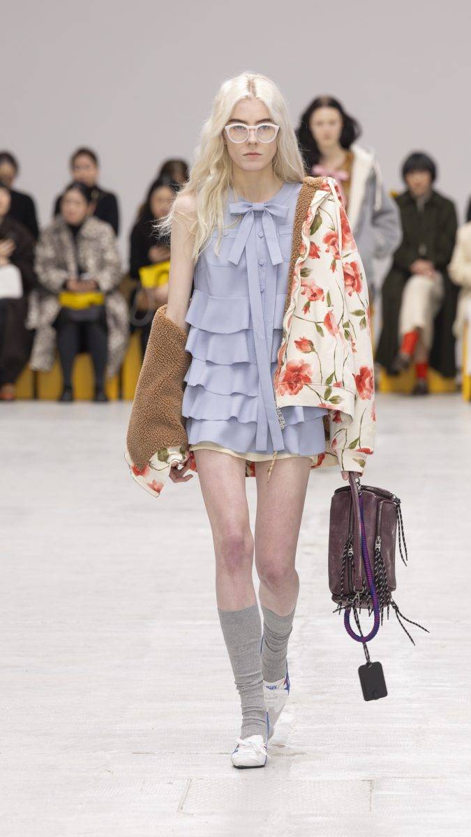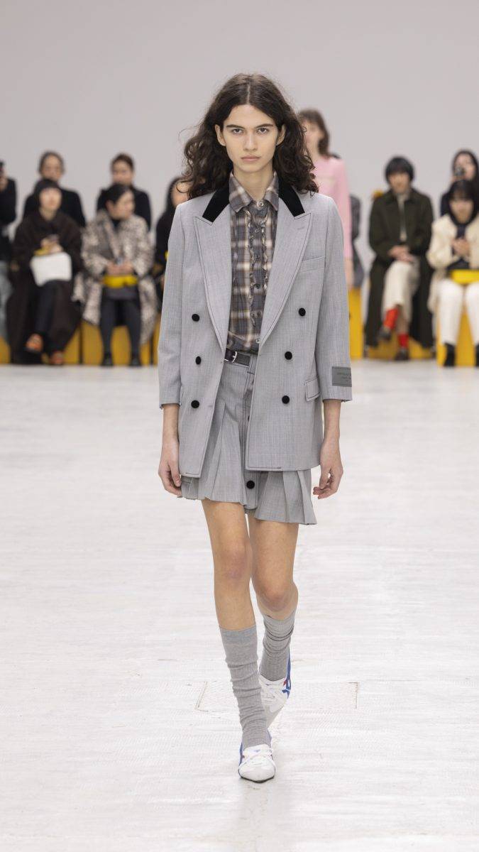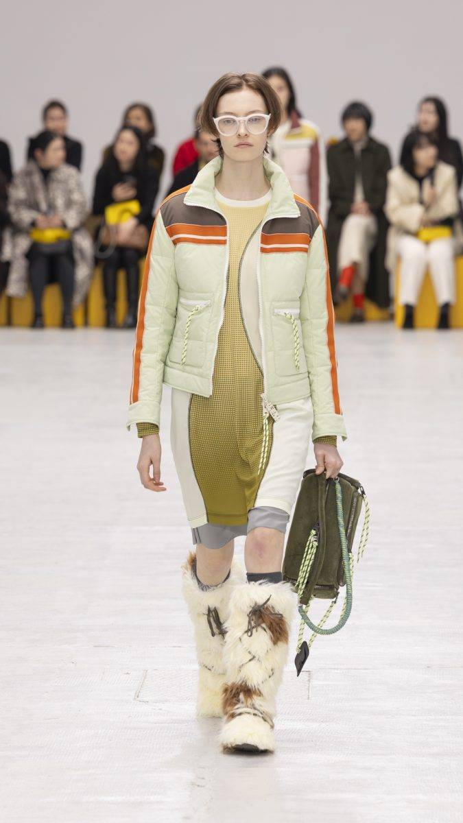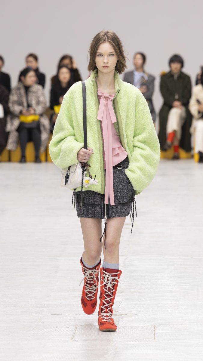 在單品的mix & match上,更見Onitsuka Tiger的大膽與嶄新思維:輕盈的百褶連身裙,襯以休閒的灰色連帽外套,蘋果綠百褶裙外搭一件短身背心,背心以紋理燈芯絨拼貼毛絨製成,材質與質感上的衝撞,令人無法移開目光。今季系列亦反覆出現了蝴蝶結完素,令作品更添浪漫感。