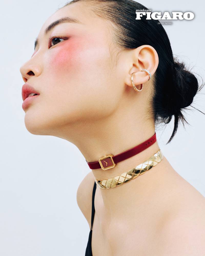 Coco Crush single earcuff in 18k beige gold & white gold with diamonds; Première ribbon red watch in yellow gold & titanium, red rubber strap with velvet touch, red-lacquered sunray dial, diamond-set crown; Coco Crush supple choker, quilted motif in 18K yellow gold. CHANEL(圖片來源:MF編輯部)