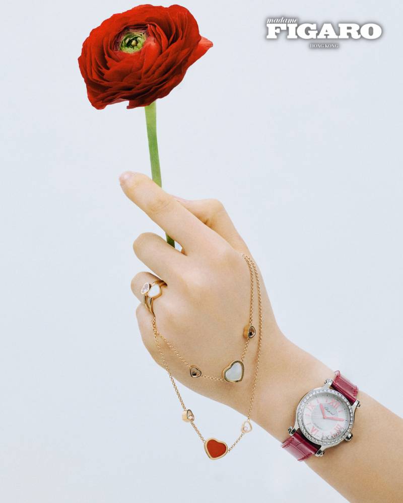 and moving diamond ; Happy Hearts 18K rose gold necklace in moving diamonds and mother of pearl; Happy Hearts 18K rose gold necklace in moving diamonds and red stone; Happy Sport Automatic 33mm watch with moving diamonds. CHOPARD(圖片來源:MF編輯部)