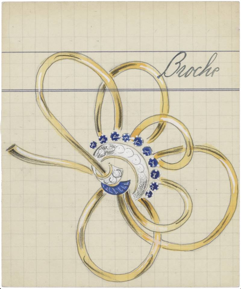 1930年代Silhouette胸針與當時的手稿,輕盈的筆觸成為Flowerlace系列的一大靈感(圖片來源:VAN CLEEF & ARPELS)
