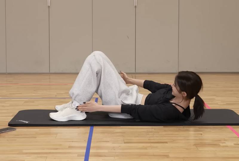 平躺在瑜珈墊上,上半身微微離開瑜珈墊,再左手觸碰左腳腳跟;右手觸碰右腳腳跟,透過身體向左或向右轉動,用手去觸碰對側的腳跟,以鍛鍊核心肌群。