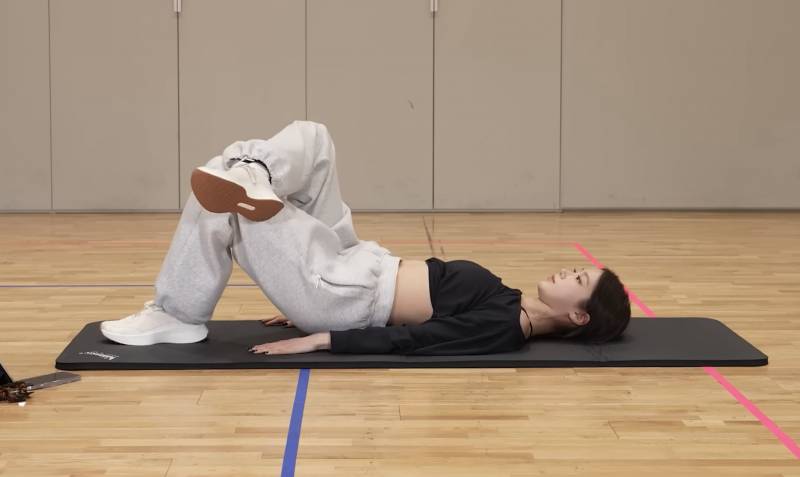 平躺在地上,抬起雙腿後放下,中村一葉提醒大家每次抬起腿時,臀部都要離開瑜珈墊,這樣才能燃燒腹部脂肪,這個動作主要針對下腹肌。