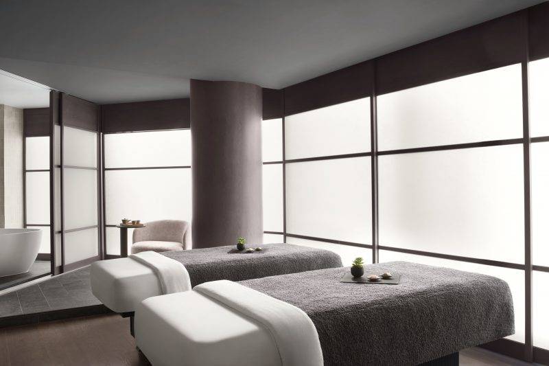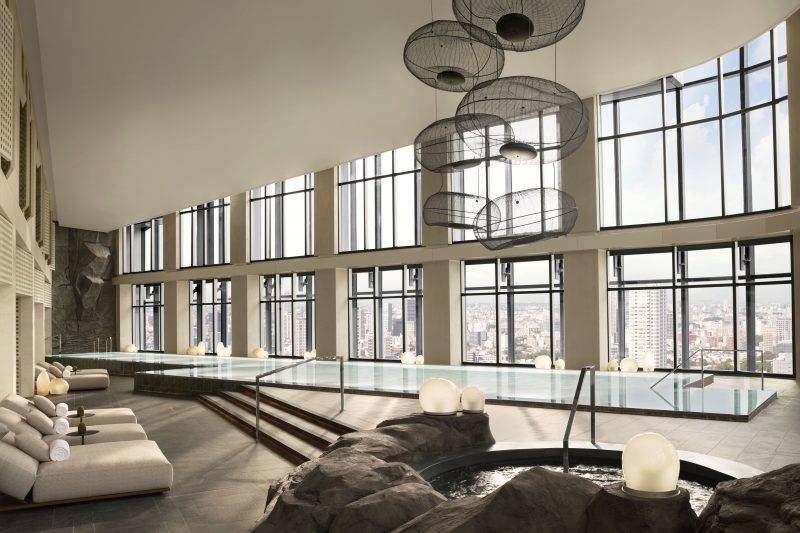 療程結束後,治療師沒有急著把我「送走」,而是邀請我到室內泳池與 spa 區自由停留。 25 米長的室內泳池像一條懸浮在城市半空的靜默藍帶,窗外是東京天際線,池畔則以極簡線條與柔和顏色鋪陳。 我在水裡慢慢划動,沒有計數,也沒有計時,只在每一次換氣時短暫地看一眼窗外的光——那種「身體在動、心卻越來越安靜」的狀態,是這一層樓非常獨特的體驗。