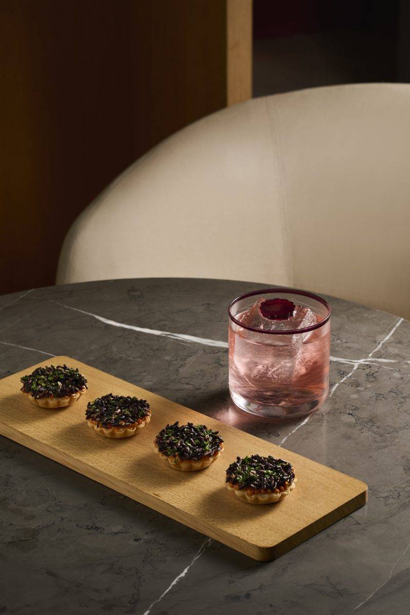 很多人對酒店酒吧裡的食物印象還停留在只是於正餐前「塞塞肚子」的小吃:炸物拼盤、薯條、起司冷盤……實用但稱不上精緻。而MGallery與Chef Pam這次設計的,卻是5款以酒吧節奏為出發點的小點,份量刻意收斂,重點在口感與味道結構,而不是飽足感。