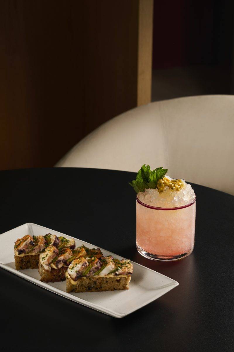 例如香脆魷魚配上墨汁醬這類搭配,外層酥脆、內裡柔軟,墨汁醬帶一點深色海味,很適合配合氣泡感或柑橘調性的雞尾酒。又或者以牛肉塔塔為基礎的小點,加入辣味奶油和魚子醬,辣度不重卻有存在感,剛好可以讓一杯偏冷冽的調酒不那麼「生硬」,喝起來更順滑。這些設計都不是為了展示高難度技法,而是讓每一口能清楚感覺到和桌上那杯酒之間的關係。