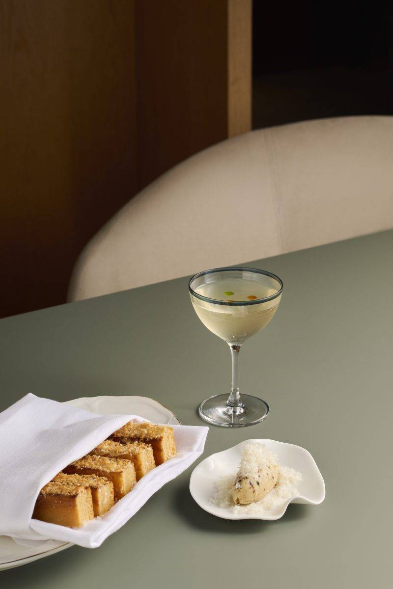 實際坐在吧台前,會感覺到節奏是被安排過的。調酒師端上的可能是一杯植物系香氣較突出的雞尾酒,帶有清新酸度與淡淡苦味,旁邊配上一道分量不大的海鮮小點,例如蟹肉多士類型的作品,酥脆口感與鹹香海味讓杯中酒的草本調性更立體。又或者是一杯風格較俐落的馬丁尼,搭配經過調味的生牛肉與少量魚子醬,利用油脂和鮮味去平衡酒精感。