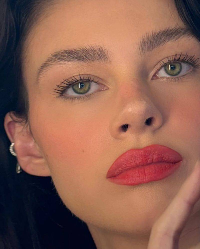 Nicola是公認的「blush girly」,她偏愛粉紅色調胭脂,輕掃在顴骨與鼻樑,創造娃娃感覺。這種鮮豔卻自然的粉紅,讓臉部瞬間活起來,最近她甚至開始嘗試紅色調胭脂,營造臉紅般的自然血色感。